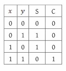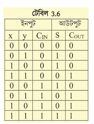 এখানে x, y হচ্ছে বাইনারি যোগের প্রদত্ত সংখ্যার বিট এবং CIN হচ্ছে আগের ধাপ থেকে আসরা ক্যারি বিটের মান। ট্রুথ টেবিলে আউটপুট দুটি, S এবং COUT। S হচ্ছে দুটি বিটের যোগফল, COUT হচ্ছে ক্যারি বিট যেটি পরের ধাপে CIN হিসেবে যুক্ত।