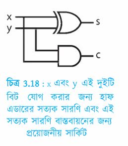 X-OR লজিক গেটটি আলোচনা করার সময় আমরা বাইনারি যোগ 1+1=10 সংখ্যাটিতে বলেছিলাম এর মাঝে ডান পাশের বিটটি যোগফল এবং বাম পাশের (হাতে থাকা) বিটটি ক্যারি (carry)। যোগফলের বিটটি X-OR গেট দিয়ে পাওয়া যায় কিন্তু ক্যারি বিটটি কীভাবে পাওয়া যায় সেটি তখন আলোচনা করা হয়নি। সেটি খুবই সহজ একটি AND গেট দিয়ে পাওয়া যেতে পারে। কাজেই আমরা একটি বিটের সাথে অন্য একটি বিটের বাইনারি যোগ নিচের সার্কিট দিয়ে পেতে পারি (চিত্র 3.18):