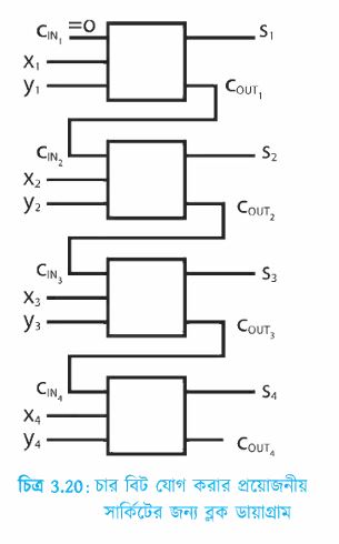 দুটি বিট যোগ করার এই সার্কিটটিকে ফুল অ্যাডার বলে। যেকোনো সত্যকার কাজের সার্কিটে অনেক বিট যোগ করতে হয়, কিন্তু প্রত্যেকটি বিটের জন্য যেন এই পুরো সার্কিটটি আঁকাতে না হয় সেজন্য আমরা পুরো সার্কিটটিকে একটা ব্লক ডায়াগ্রাম দিয়ে দেখিয়েছি, এখানে শুধু ইনপুট এবং আউটপুট লাইনগুলো দেখানো হয়েছে। চার বিটের একটি বাইনারি যোগের জন্য কীভাবে চারটি ফুল ডার সার্কিট যোগ করতে হবে সেটি ব্লক ডায়াগ্রাম গুলো যুক্ত করে দেখানো হলো (চিত্র 3.20)।