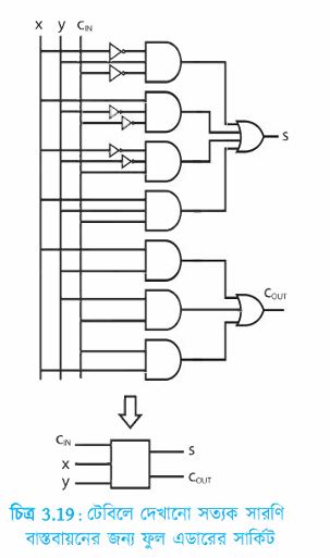 ট্রুথ টেবিলের দিকে তাকিয়ে আমরা দেখতে পাচ্ছি x, y এবং CIN এর সম্ভাব্য আটটি ভিন্ন ভিন্ন ইনপুটের এর ভেতর চারটি ক্ষেত্রে যোগফল (S) এবং চারটি ক্ষেত্রে ক্যারি (COUT) আউটপুটের মান 1 হতে হবে। ডিকোডারের বেলায় আমরা যেভাবে AND গেটের আউটপুট 1 পাওয়ার জন্য NOT গেট দিয়ে ইনপুট পরিবর্তন করেছিলাম, এখানেও আমরা হুবহু একই পদ্ধতি গ্রহণ করতে পারি। 3.19 চিত্রে সেভাবে সার্কিটটি এঁকে দেখানো হলো।