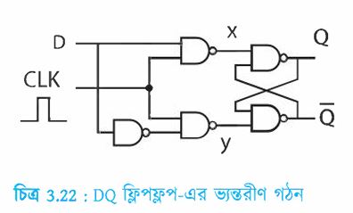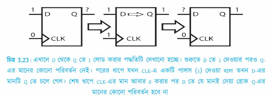 এই ধরনের সার্কিটে নাম DQ ফ্লিপফ্লপ। 3.23 চিত্রে বিষয়টি ব্যাখ্যা করা হয়েছে, সহজ করার জন্য Q দেখানো হয়নি। এক কথায় বলা যায়, D এর মানটি একটি পালস দিয়ে Q এ নিয়ে আসা হয়, মানটি সেখানে সংরক্ষিত থাকে, D এর মান পরিবর্তন করা হলেও Q-এর মানের পরিবর্তন হয় না। শুধু আরেকটি CLK পালস দিয়ে D এর নতুন মান Q তে লোড করা যাবে। এই ধারণাটি নিয়ে তোমাদের মাঝে যেন কোনো বিভ্রান্তি না থাকে কারণ এর পরের সব কয়টি সার্কিটে আমরা DQ ফ্লিপফ্লপ ব্যবহার করব।