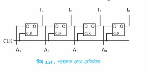 3.24 চিত্রে চারটি DQ ফ্লিপফ্লপ পাশাপাশি বসিয়ে একটি সার্কিট তৈরি করা হয়েছে। যেহেতু একই সাথে চারটি ফ্লিপফ্লপে CLK পালস দেওয়া হয়, তাই এই চারটি ফ্লিপফ্লপ একই সাথে চার বিট তথ্য সংরক্ষণ করতে পারে। যদি A0, A1, A2 এবং A3 তে চার বিট তথ্য দেওয়া হয় তাহলে সেই চার বিট তথ্য CLK পালস দেওয়ার সাথে সাথে I0, I1, I2 এবং I3 তে সংরক্ষিত হয়ে যাবে। তখন A0, A1, A2 এবং A3-এর বিটগুলো পরিবর্তিত হলেও I0, I1, I2 এবং I3 তে সংরক্ষিত তথ্যের কোনো পরিবর্তন হবে না। শুধু নতুন একটি CLK পালস দেওয়া হলেই পরিবর্তিত A0, A1, A2 এবং A3 এর মান I0, I1, I2 এবং I3 তে লোড হবে। ফ্লিপফ্লপের সংখ্যা বাড়িয়ে পুরো এক বাইট কিংবা কয়েক বাইট তথ্য একসাথে রাখা সম্ভব।