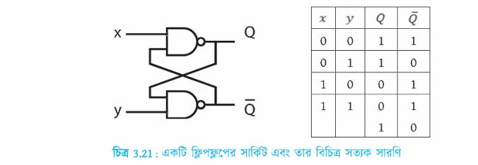 কিন্তু আমাদের অনেক সময়েই একটি সার্কিটে কোনো একটি মান সংরক্ষণ করতে হয়, আমরা সেটাকে মেমোরি বলে থাকি। এখন আমরা এ ধরনের একটি সার্কিটের কথা বলব যেখানে একটি ইনপুট দিয়ে সেই ইনপুটের মানটিকে সংরক্ষণ করা সম্ভব। এই ধরনের সার্কিটকে বলে ফ্লিপফ্লপ। 3.21 চিত্রে একটি ফ্লিপফ্লপের সার্কিট দেখানো হলো। এখানে Q একটি আউটপুট এবং Q তার পূরক।