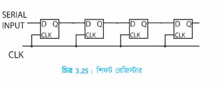 প্যারালাল লোড রেজিস্টারে DQ ফ্লিপফ্লপগুলোতে সিগন্যাল একই সাথে লোড করা হয়। ভিন্ন আরেক ধরনের ফ্লিপফ্লপ আছে যেখানে ফ্লিপফ্লপগুলোর আউটপুট Q অন্যটির ইনপুট D-এর সাথে সংযুক্ত করে প্রতি ক্লক পালসে এক ফ্লিপফ্লপের সিগন্যাল পরের ফ্লিপফ্লপে পাঠানো যায়। এই ধরনের রেজিস্টারকে শিফট রেজিস্টার বলে। শিফট রেজিস্টারের ইনপুটে সিরিয়াল ডেটা দিয়ে আউটপুটে প্যারালাল ডাটা পাওয়া যায়। 3.25 চিত্রে একটি শিফট রেজিস্টারের সার্কিট দেখানো হলো।