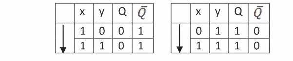 উত্তরটি কিন্তু বেশ সহজ। এটি নির্ভর করে x = 1 এবং y = 1 অবস্থাটির আগের অবস্থা কী। যদি ঠিক আগের অবস্থা x = 0 এবং y = 1 হয়ে থাকে তাহলে Q হবে 1 (এবং Q হবে তার বিপরীত অর্থাৎ 0) এবং যদি আগের অবস্থা x = 1 এবং y = 0 হয়ে থাকে তাহলে Q হবে 0 (এবং Q হবে তার বিপরীত অর্থাৎ 1) ট্রুথ টেবিলে সেটা এভাবে দেখানো যেতে পারে: