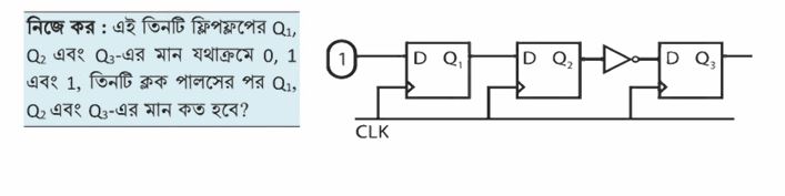 যেহেতু D-এর মানের বিপরীত মানটি অর্থ Q-এ লোড হয়, তাই প্রথম ফ্লিপফ্লপে Q-এর মান একবার 0 এবং পরের বার 1 হতে থাকবে। পাশের টেবিলে সেটা দেখানো হয়েছে। (লক্ষ্য কর, টেবিলে প্রথম q0 এর মান সবচেয়ে ডানদিকে বসিয়ে অন্যগুলো ক্রমান্বয়ে তার বামে বসানো হয়েছে) পরের ফ্লিপফ্লপ একই ব্যাপারে ঘটবে তবে যেহেতু Q0 কে Q1 এর ক্লক হিসেবে ব্যবহার করা হচ্ছে তাই দ্বিতীয় ফ্লিপফ্লপের Q আউটপুট পরিবর্তিত হবে প্রকৃত CLK এর দুটি পালস পরে পরে-যেটি টেবিলে দেখানো হয়েছে। একইভাবে পরের ফ্লিপফ্লপের আউটপুট পরিবর্তিত হবে প্রকৃত CLK এর চার পালস পরে পরে।