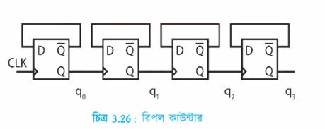 কাউন্টার এক ধরনের ডিজিটাল সার্কিট যেটি গণনা করতে পারে। আমরা DQ ফ্লিপফ্লপ দিয়ে খুব সহজে কাউন্টার তৈরি করতে পারি। DQ ফ্লিপফ্লপের আউটপুট Q এবং Q দুটোই থাকে তবে যেহেতু রেজিস্টার তৈরি করার সার্কিটগুলোতে Q ব্যবহার করার দরকার হয়নি, তাই সার্কিটে ইচ্ছা করে Qটি দেখানো হয়নি। কাউন্টার তৈরি করার সময় Q এবং Q দুটো আউটপুটেরই প্রয়োজন হবে, তাই 3.26 চিত্রে দুটোই দেখানো হয়েছে। তবে সার্কিটটি সহজে আঁকার জন্য Qটি উপরে এবং Qটি নিচে আঁকা হলো। একটি খুবই সহজ কাউন্টারের সার্কিট 3.26 চিত্রে দেখানো হয়েছে।