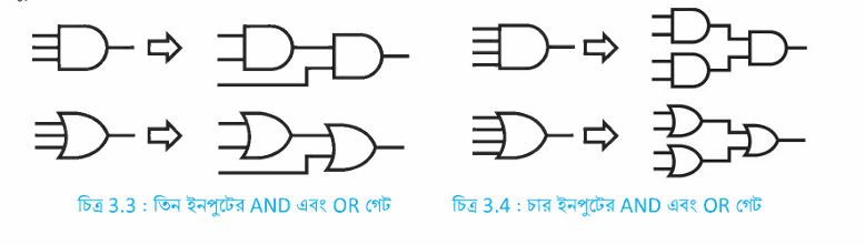 আমরা যদিও দুই ইনপুটের AND এবং OR গেটের কথা বলেছি কিন্তু দুই থেকে বেশি ইনপুটের AND এবং OR গেট রয়েছে। শুধু তাই নয়, ইচ্ছে করলে আমরা দুই গেটের লজিক গেট ব্যবহার করেই দুই থেকে বেশি ইনপুটের লজিক গেট তৈরি করতে পারব।