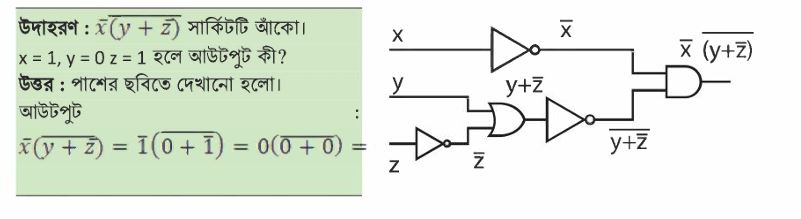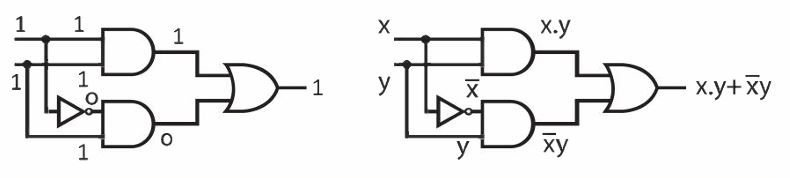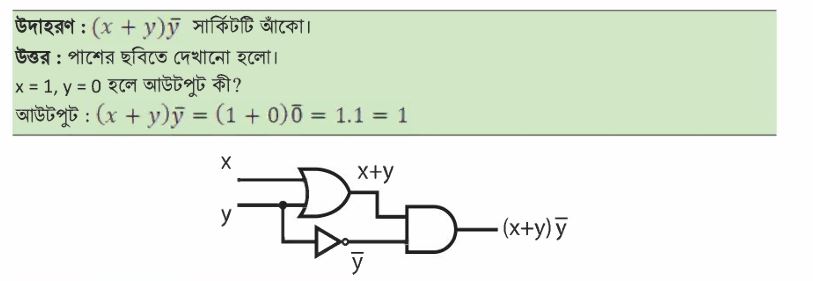 উদাহরণ: নিচে দেখানো সার্কিটের ইনপুট দুটি যদি 1 হয় তাহলে আউটপুট কী হবে? একই সার্কিটে আমরা যদি নির্দিষ্ট মান না দিয়ে ইনপুট দুটিকে x এবং y বলি তাহলে আউটপুট কী?