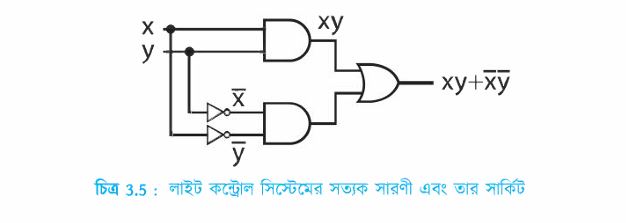 উত্তর: মনে করি সুইচ দুটি হচ্ছে একটা সার্কিটের দুটি ইনপুট x এবং y, যখন x কিংবা y এর মান 1 তখন সুইচটি অন অবস্থায় আছে এবং যখন মান 0 তখন অফ অবস্থায় আছে। যেহেতু মাত্র দুইটি সুইচ কাজেই আমাদের মাত্র চারটি অবস্থানের জন্য আউটপুট F বের করতে হবে। আলোটি আমরা F আউটপুট দিয়ে প্রকাশ করতে পারি অর্থাৎ যখন F এর মান 1 তখন আলোটি জ্বলবে যখন F এর মান 0 তখন আলোটি নিভে যাবে। যখন দুটি সুইচই অফ, ধরা যাক তখন আলোটি জ্বলছে, অর্থাৎ x=0, y=0 এবং F=1 এটি হবে সত্যক সারণির প্রথম অবস্থান। এখান থেকে শুরু করে আমরা অন্য অবস্থাগুলো বের করতে পারব। এই অবস্থান থেকে যদি যে কোনো একটি সুইচ পরিবর্তন করতে চাই তাহলে সেটা হওয়া সম্ভব: x=0, y=1 কিংবা x=1, y=0 এবং তখন F = 0 হতে হবে (অর্থাৎ আলোটি নিভে যেতে হবে।) আমরা সত্যক সারণির আরো দুইটি তথ্য পেয়ে গেছি। সত্যক সারণির শেষ অবস্থান x=1, y=1, এই অবস্থানে পৌঁছাতে হলে যেহেতু x=0, y=1 কিংবা x=1, y=0 অবস্থানের একটি সুইচের পরিবর্তন করতে হবে, কাজেই F এর মানও 0 থেকে 1 হতে হবে। 5 নং চিত্রে এই লাইট কন্ট্রোল সিস্টেমের ট্রুথ টেবিল এবং নিচের ছবিতে এটি বাস্তবায়ন করার জন্য প্রয়োজনীয় সার্কিটটি দেখানো হয়।
