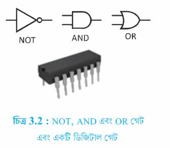 বুলিয়ান এলজেবরার তিনটি প্রক্রিয়াকে বাস্তবায়ন করার জন্য যে তিনটি ইলেকট্রনিক গেট বা লজিক গেট ব্যবহার করা হয় সেগুলো নিচে 3.2 চিত্রে দেখানো হলো।