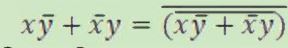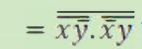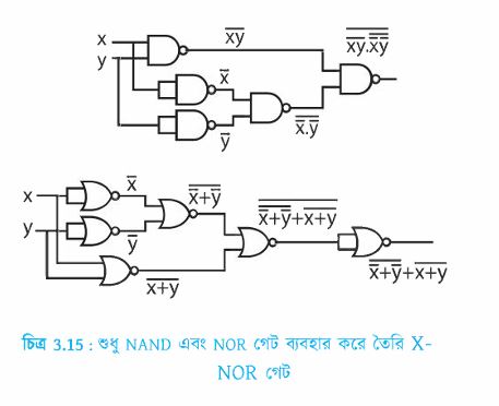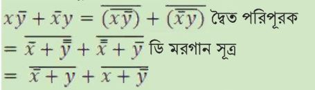 একইভাবে শুধু NOR ব্যবহার করে X-OR তৈরি করতে হলে xy এবং xy, -এর ভেতরকার বুলিয়ান গুণকে ডি মরগান সূত্র ব্যবহার করে যোগে রূপান্তর করতে হবে।