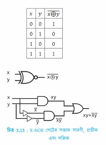 উত্তর: আমরা আগের উদাহরণের প্রক্রিয়ায় শুধু NAND ব্যবহার করে X-NOR তৈরি করতে পারি। X-NOR এর লজিক হচ্ছে: xy + x y লজিক অপরিবর্তিত রেখে দ্বৈত পরিপূরক কর তাহলে আমরা পাই:
