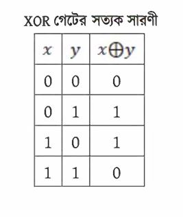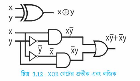 ১-এর সঙ্গে ১ -এর যোগফলে দুটি বিট এসেছে, এখানে ডান পাশের বিটটিকে আমরা যোগফল এবং বাম পাশের বিটটিকে বলতে পার ক্যারি। ক্যারি বিটটি নিয়ে আমরা আপাতত মাথা না ঘামিয়ে শুধু যোগফলের বিটটি নিয়ে আলোচনা করি। আমরা দেখেছি বুলিয়ানের যোগটিতে 1+1 করে আমরা 0 পাই না, 1 পাই। কাজেই বুলিয়ানের যোগ করার লজিক গেট AND কে আমরা বাইনারি যোগে ব্যবহার করতে পারি না। বাইনারির যোগে ব্যবহার করার জন্য Exclusive OR বা সংক্ষেপে XOR নামে আরেকটি লজিক গেট ব্যবহার করা হয়। এই গেটের সত্যক সারণী এবং প্রতীক 3.12 চিত্রে দেখানো হলো। সহজভাবে বলা যায় XOR গেটে ইনপুট দুটি ভিন্ন হলে আউটপুট 1, তা না হলে আউটপুট 01 X-OR গেটের লজিক xy + xy, তোমরা এটা পরীক্ষা করে নিশ্চিত হয়ে নাও।