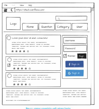এরপরে চিন্তা করতে হবে ওয়েবসাইটে কী কী পেইজ থাকবে। প্রতিটি পেইজের জন্য একটি লেআউট ডিজাইন করতে হবে। লে-আউট বলতে বোঝানো হচ্ছে পেইজের কোন স্থানে কী দেখানো হবে। এই ডিজাইনটি প্রাথমিকভাবে কাগজে-কলমে করা যেতে পারে। এ জাতীয় কাগজ-কলমে আঁকা ডিজাইনকে বলা হয় ওয়ারফ্রেম (wireframe)। ধরা যাক, একটি প্রশ্ন ও তার সংশ্লিষ্ট উত্তরগুলোর পেইজটি এরকম (পরের ছবি দ্রষ্টব্য) হতে পারে। আবার চাইলে কোনো গ্রাফিক্স ডিজাইন সফটওয়্যার, যেমন- অ্যাডোবি ইলাস্ট্রেটর (Adobe Illustrator) বা গিম্প (Gimp) ইত্যাদি ব্যবহার করেও এ জাতীয় ডিজাইন তৈরি করা যায়।